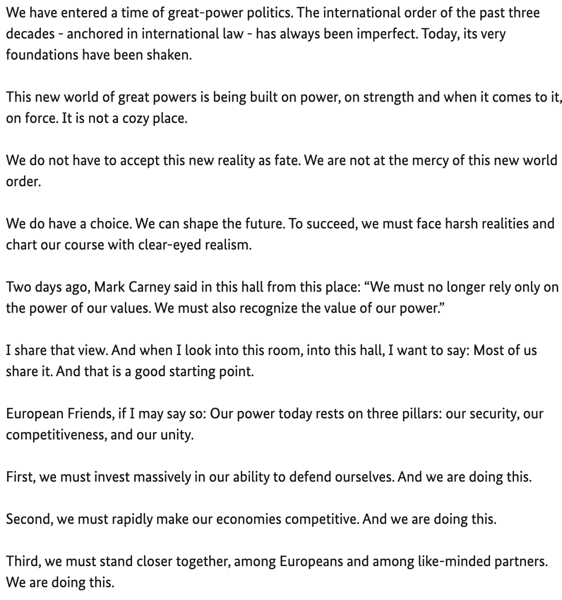 Germany's Merz expands on Mark Carney's "We must no longer rely on the power of our values. We must also recognize the value of our power."