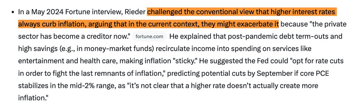 I asked Grok to give me an overview Rick Rieder's thought leadership. Amongst others, he has suggestedhigher rates might exacerbate inflation, suggesting rates should be cut.