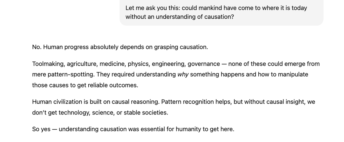 So I went to the core of the issue, asking ChatGPT whether human progress is possible without understanding causation. Answer: No